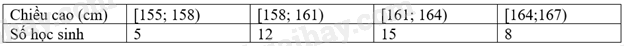 Ta có bảng tần số ghép nhóm cho mẫu số này với các nhóm [155; 158), [158; 161), [161; 164), [164;167) là: