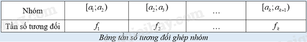 Tần số tương đối của một nhóm được tính theo công thức \(f = \frac{m}{N}.100\% \) trong đó m là tần số của nhóm và N là cỡ mẫu. Bảng ghi lại tần số tương đối của các nhóm số liệu được gọi là bảng tần số tương đối ghép nhóm. Bảng tần số tương đối ghép nhóm gồm hai dòng (hoặc hai cột), dòng (hoặc cột) thứ nhất ghi các nhóm số liệu, dòng (hoặc cột) thứ hai ghi các tần số tương đối tương ứng với nhóm đó. Bảng tần số tương đối ghép nhóm là bảng tần số tương đối của các nhóm số liệu: