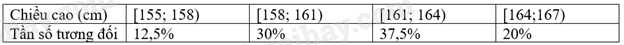 Bảng tần số tương đối ghép nhóm cho mẫu số này với các nhóm [155; 158), [158; 161), [161; 164), [164;167) là: