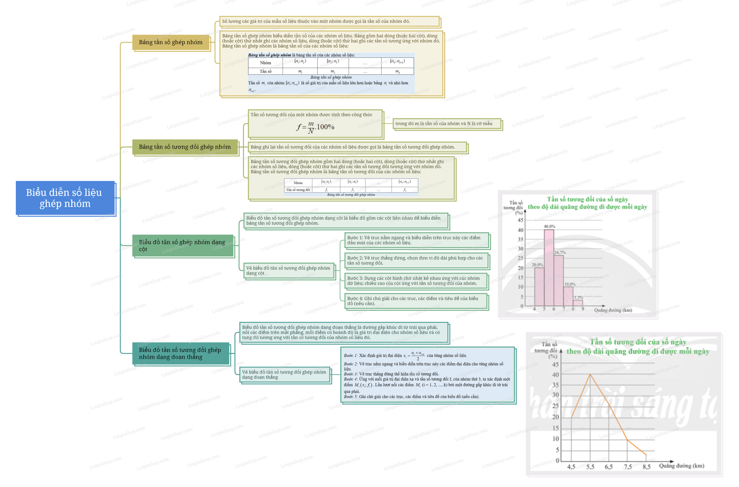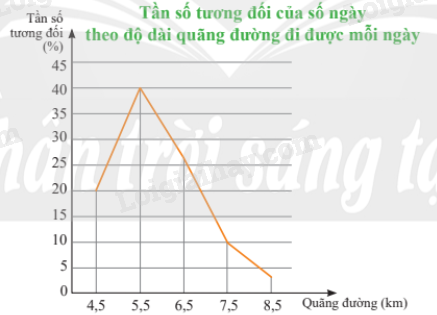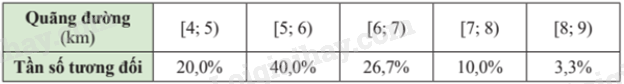 Ví dụ: Cho bảng tần số tương đối ghép nhóm thống kê lại độ dài quãng đường (đơn vị (km) Thủy đi bộ mỗi ngày trong tháng 6.
