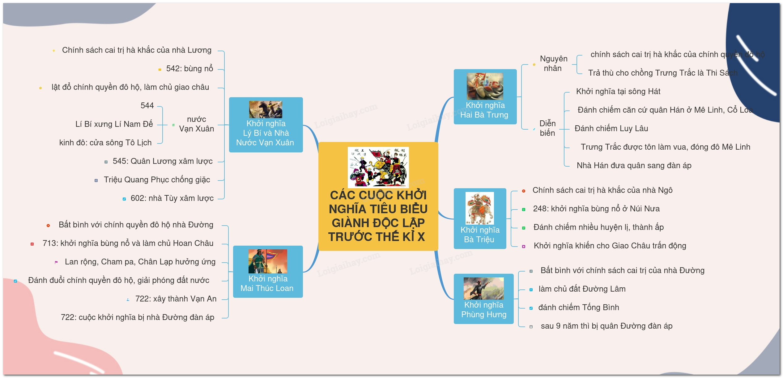 Sơ đồ tư duy các cuộc khởi nghĩa tiêu biểu giành độc lập trước thế kỉ X