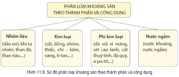 + Theo trạng thái vật lí: khoáng sản rắn (sắt, nhôm, thiếc,...) khoáng sản lỏng (dầu mỏ, nước ngầm,...) và khoáng sản khí (khí thiên nhiên).