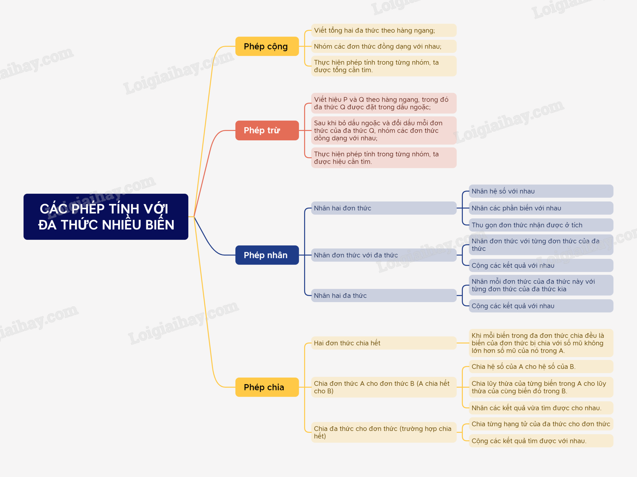 Để nhân hai đa thức, ta nhân mỗi đơn thức của đa thức này với từng đơn thức của đa thức kia, rồi cộng các kết quả với nhau.