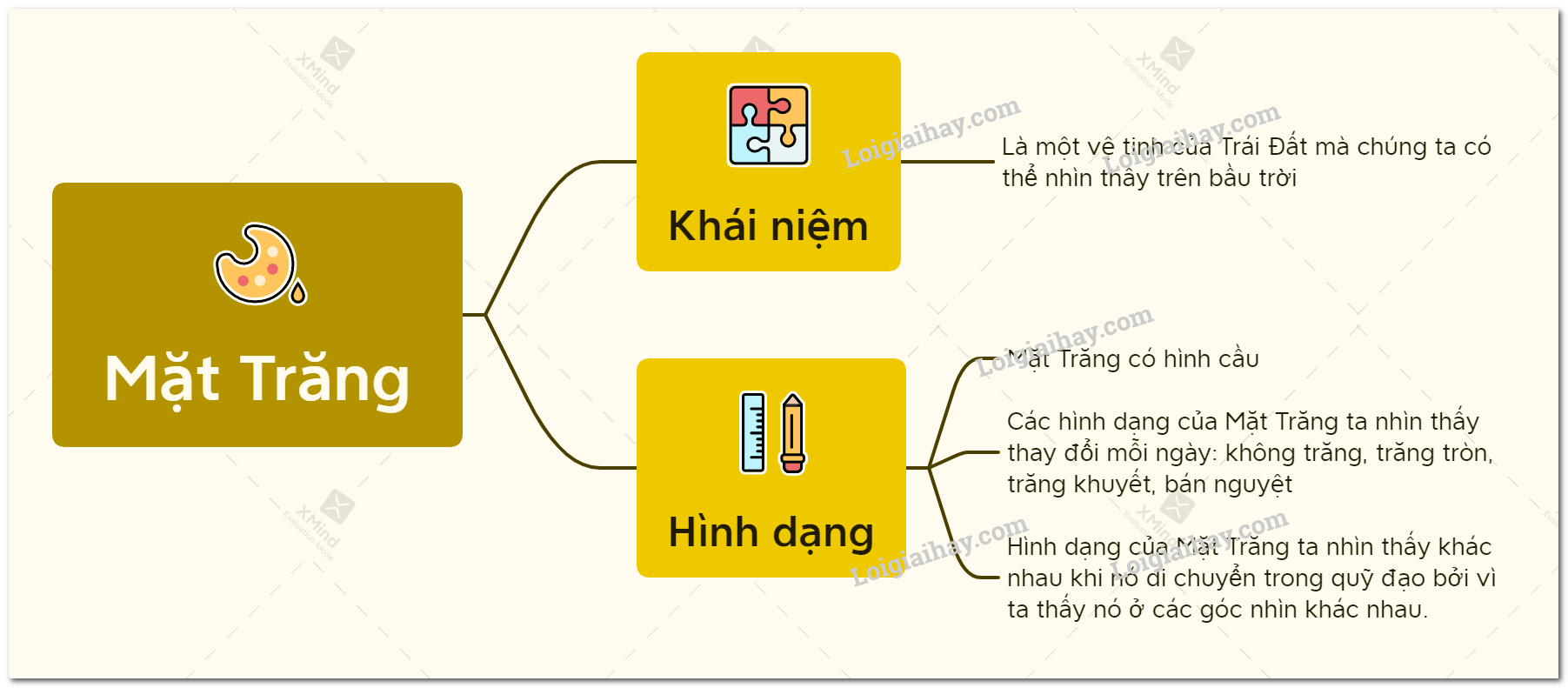 - Các hình dạng nhìn thấy của Mặt Trăng là: Trăng tròn, Trăng khuyết, Trăng bán nguyệt, Trăng lưỡi liềm, không Trăng.