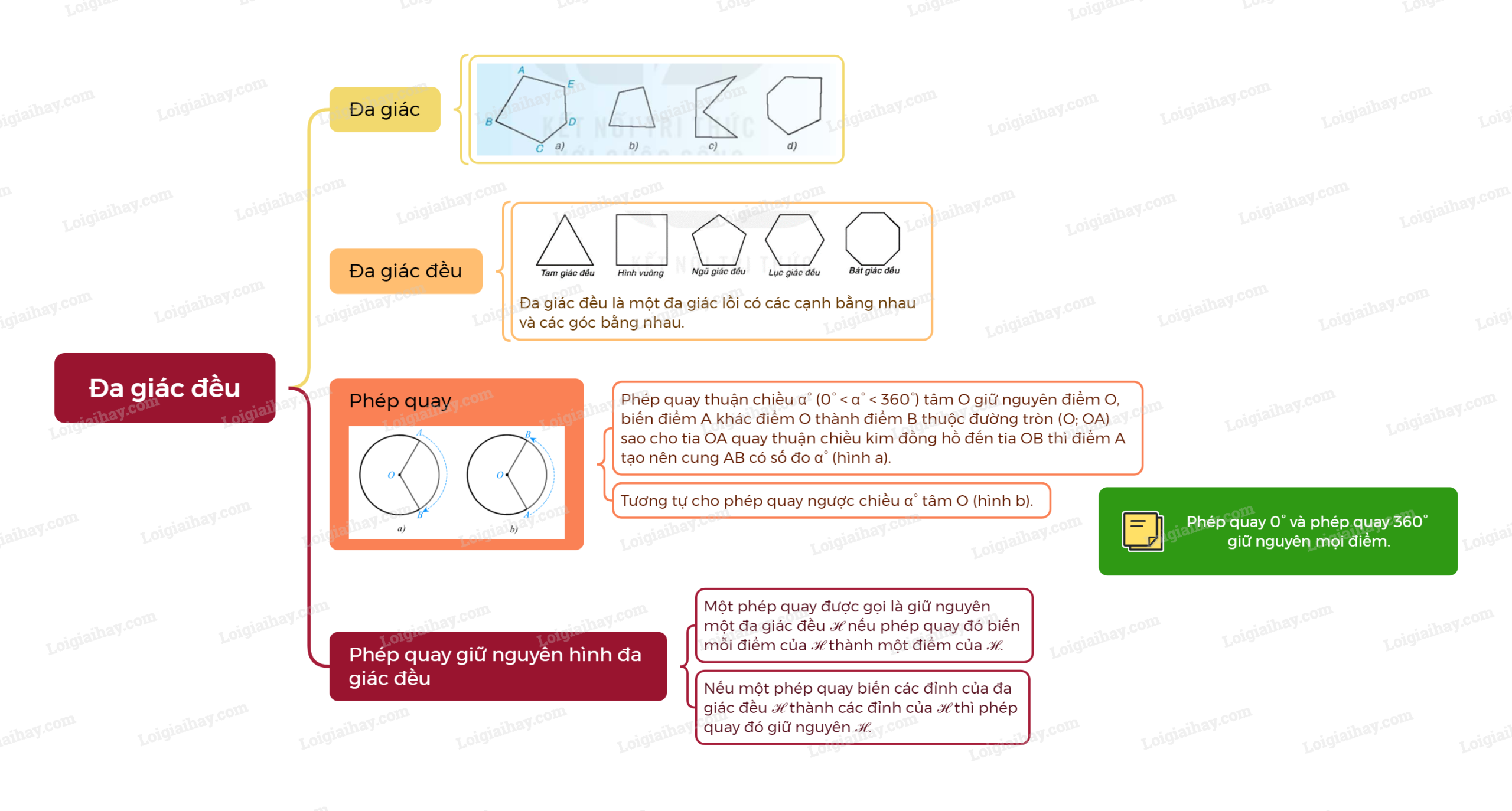Một phép quay được gọi là giữ nguyên một đa giác đều ℋ nếu phép quay đó biến mỗi điểm của ℋ thành một điểm của ℋ. Nếu một phép quay biến các đỉnh của đa giác đều ℋ thành các đỉnh của ℋ thì phép quay đó giữ nguyên ℋ. |