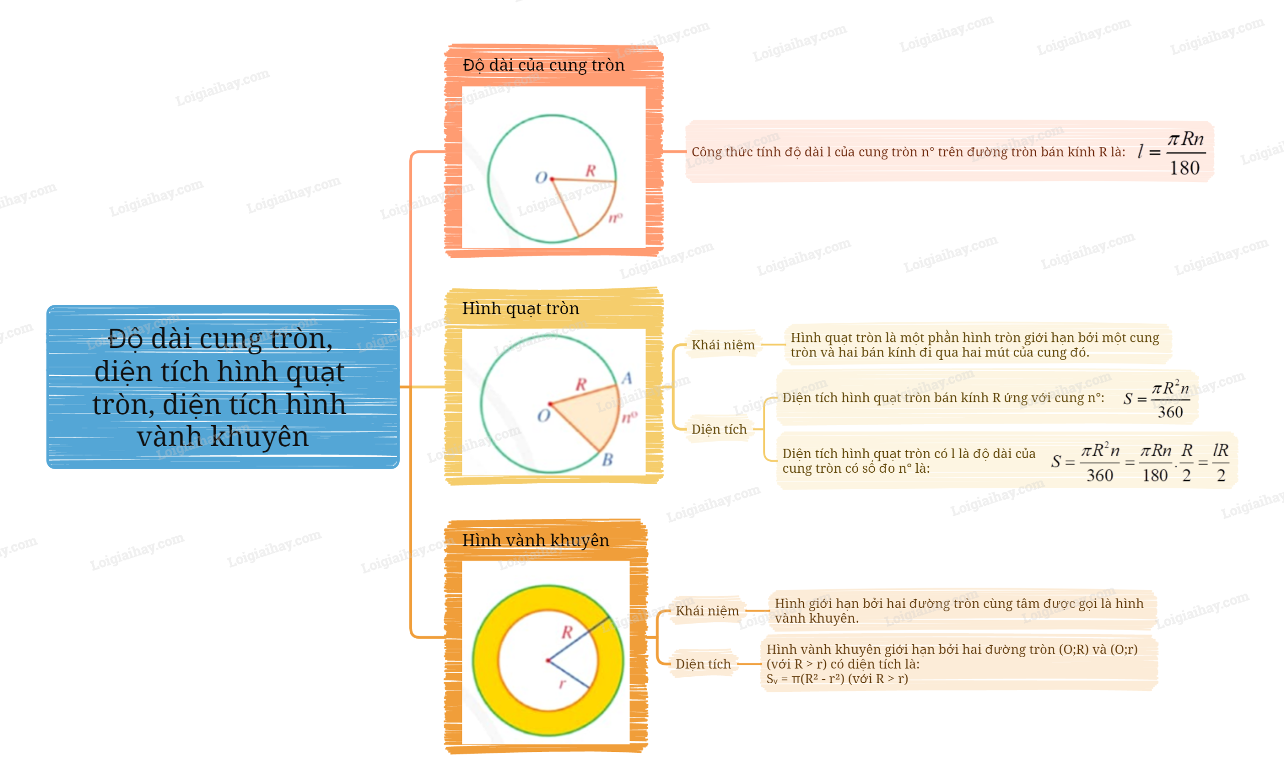 \(S = \frac{{\pi {R^2}n}}{{360}} = \frac{{\pi Rn}}{{180}}.\frac{R}{2} = \frac{{lR}}{2}\).