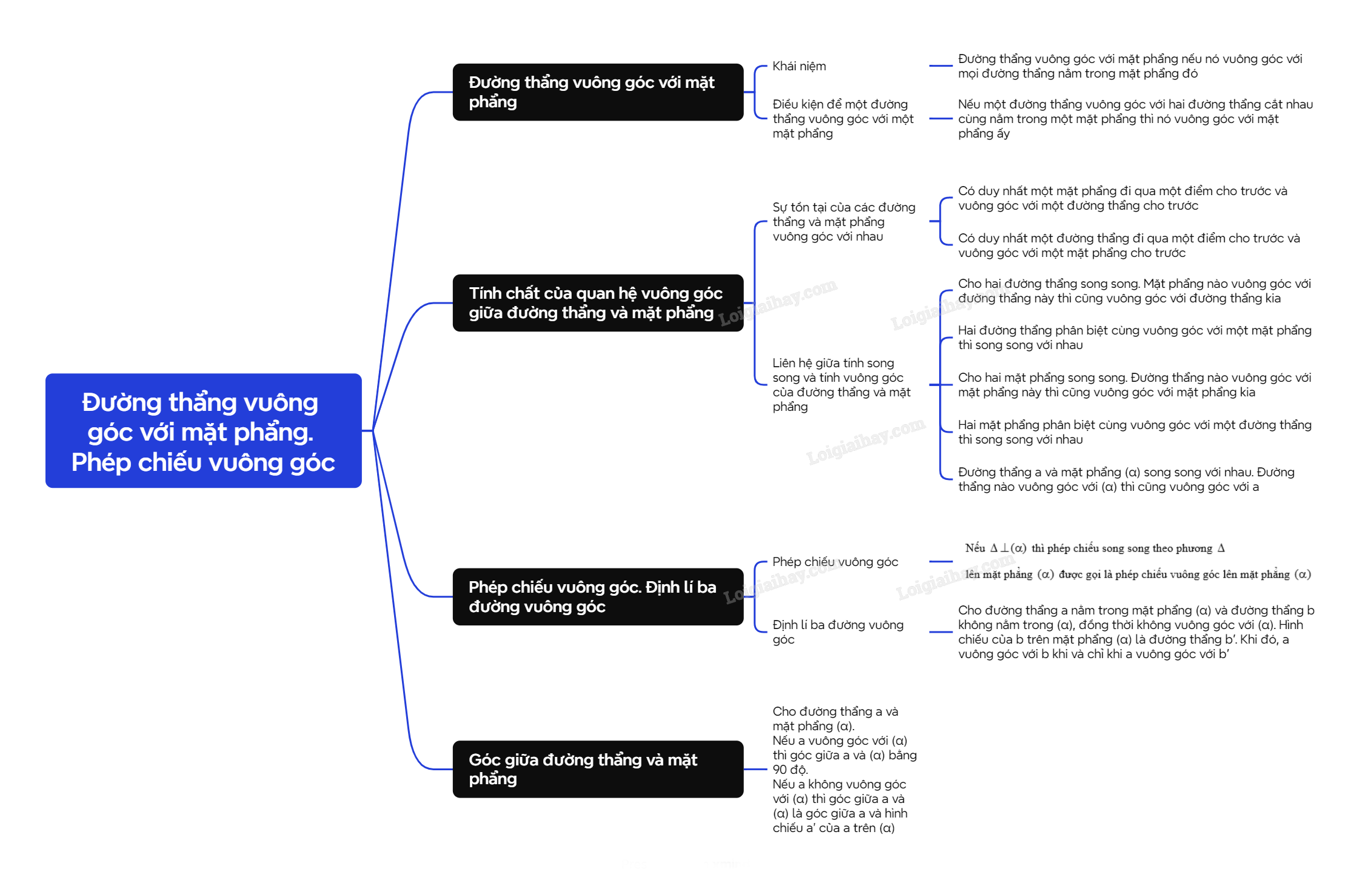 - Có duy nhất một mặt phẳng đi qua một điểm cho trước và vuông góc với một đường thẳng cho trước. - Có duy nhất một đường thẳng đi qua một điểm cho trước và vuông góc với một mặt phẳng cho trước. |