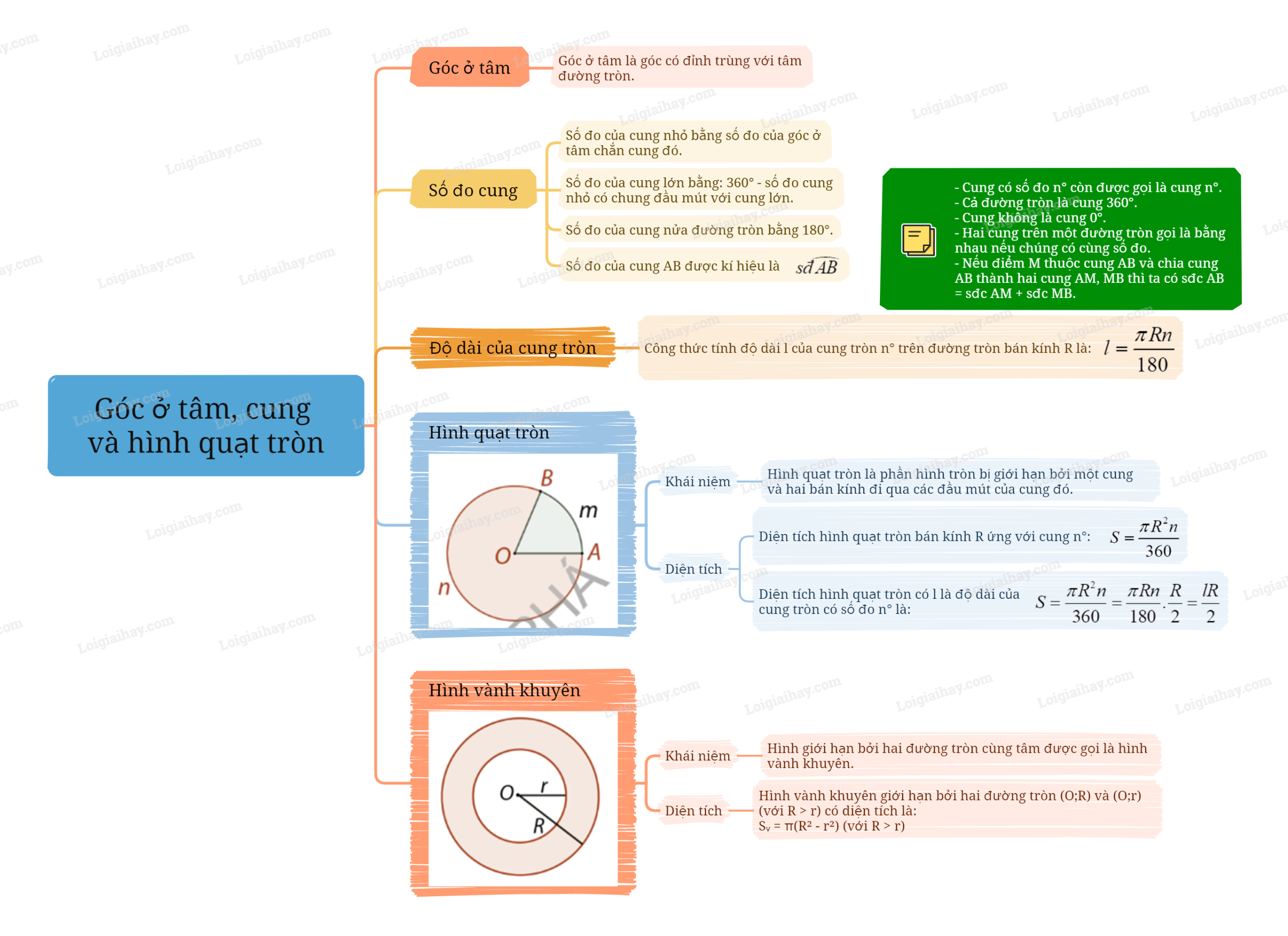 Công thức độ dài cung \({n^0}\) của đường tròn bán kính R: \(l = \frac{{\pi Rn}}{{180}}\). |