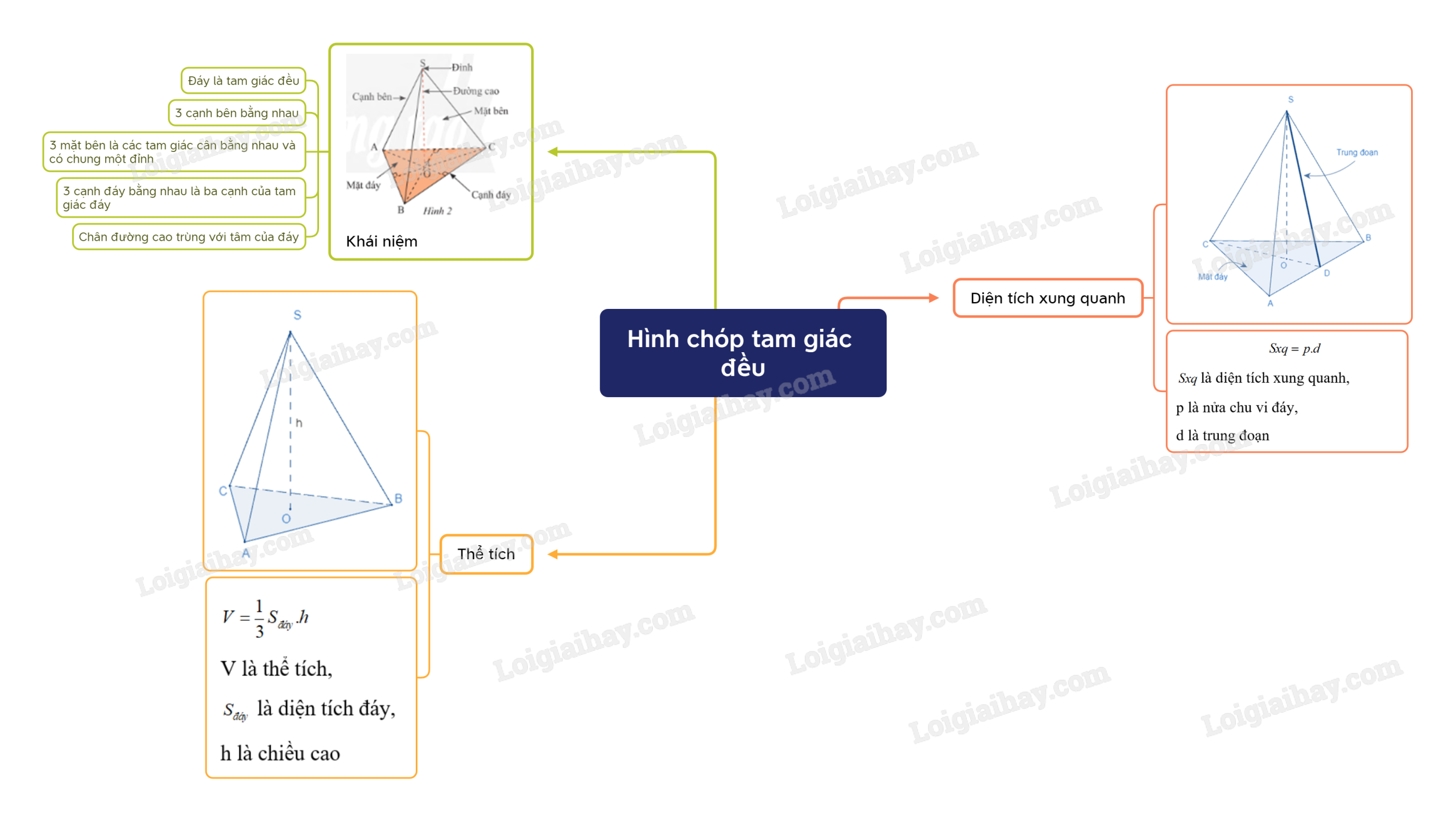 - 3 mặt bên là các tam giác cân bằng nhau và có chung một đỉnh.