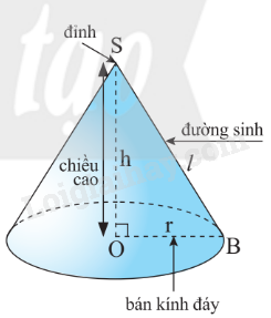 – S gọi là đỉnh của hình nón. – Cạnh OB quét thành hình tròn gọi là đáy của hình nón. Bán kính của đáy gọi là bán kính đáy của hình nón. – Cạnh SB quét thành mặt xung quanh của hình nón. Mỗi vị trí của SB là một đường sinh. – Độ dài SO là chiều cao của hình nón. |