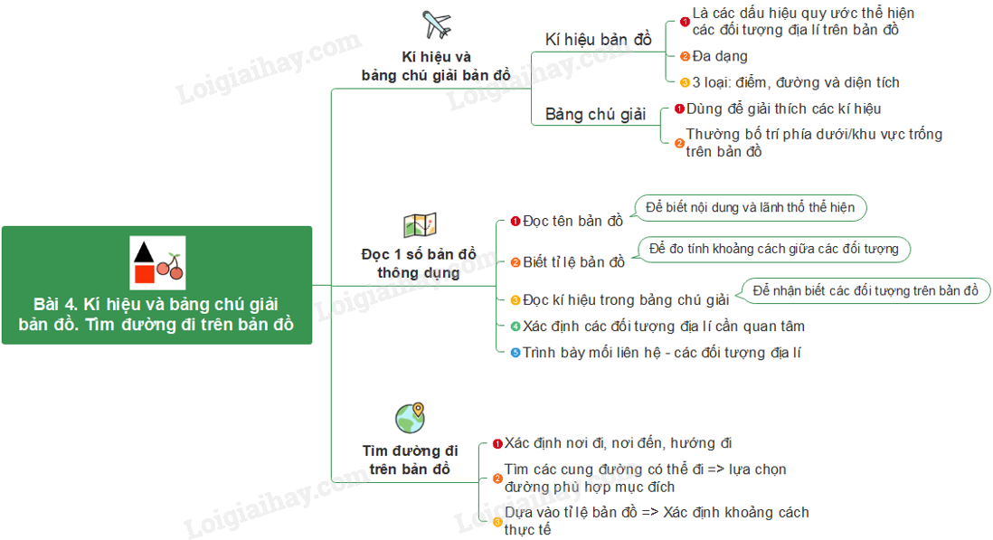 Sơ đồ tư duy kí hiệu và bảng chú giải bản đồ. Tìm đường đi trên bản đồ