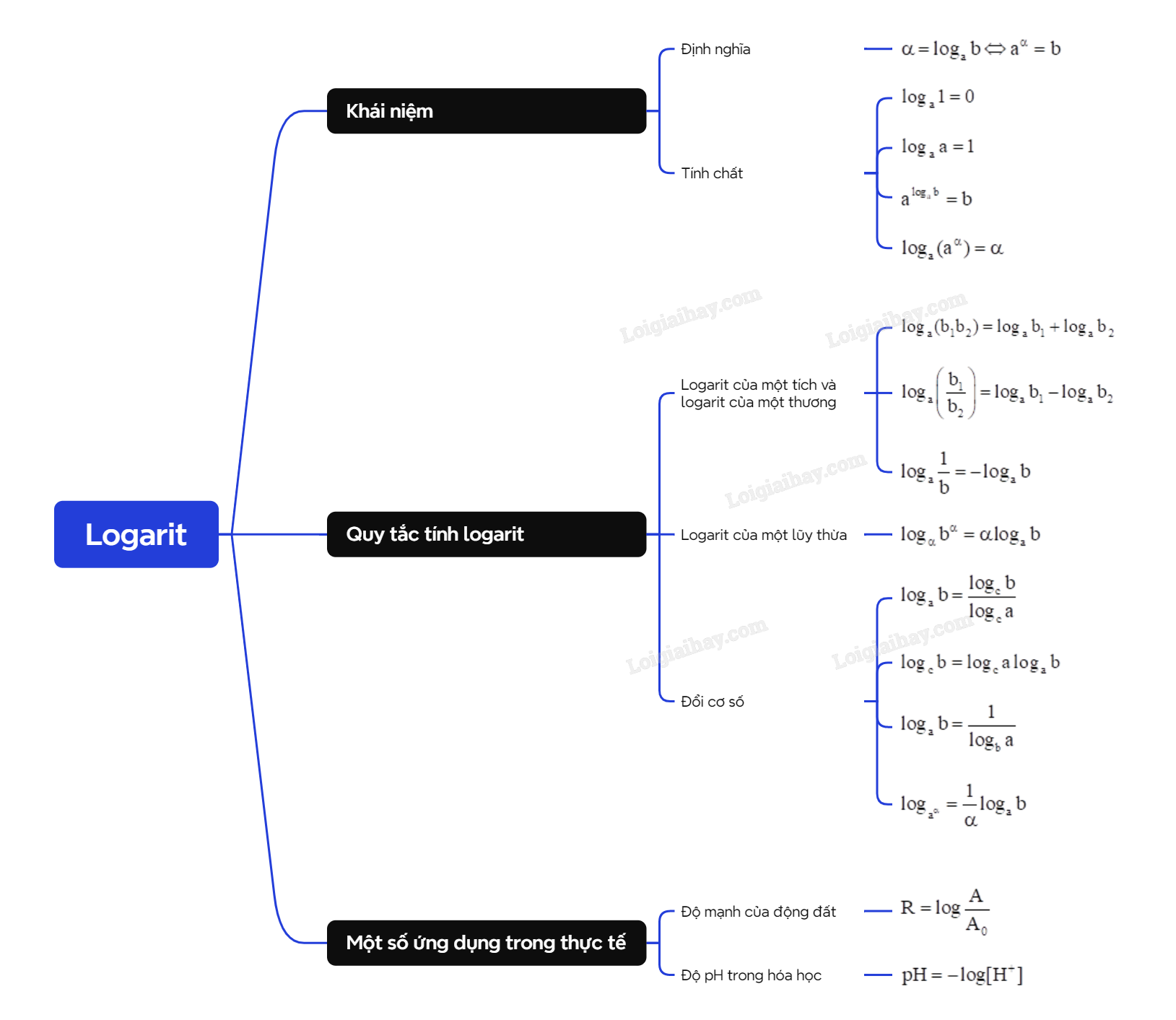 - Với a, b là hai số thực dương khác 1, ta có \({\log _a}b = \frac{1}{{{{\log }_b}a}}\) hay \({\log _a}b.{\log _b}a = 1\).