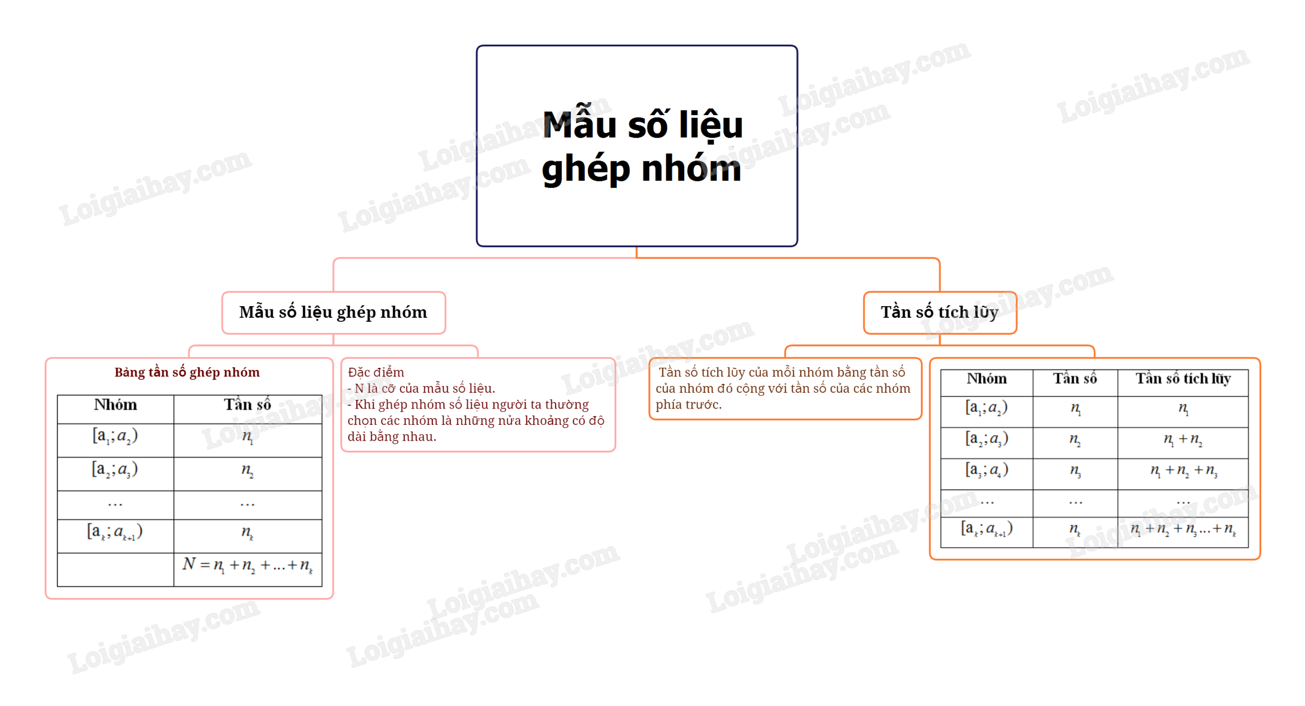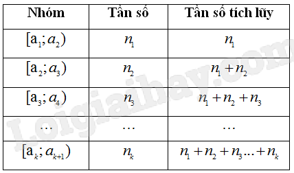 - Khi ghép nhóm số liệu người ta thường chọn các nhóm là những nửa khoảng có độ dài bằng nhau. Nhóm đầu tiên chứa số liệu nhỏ nhất, nhóm cuối cùng chứa số liệu lớn nhất của mẫu. Trong bảng, nhóm cuối cùng cũng có thể lấy đoạn \(\left[ {{a_k};{a_{k + 1}}} \right]\)