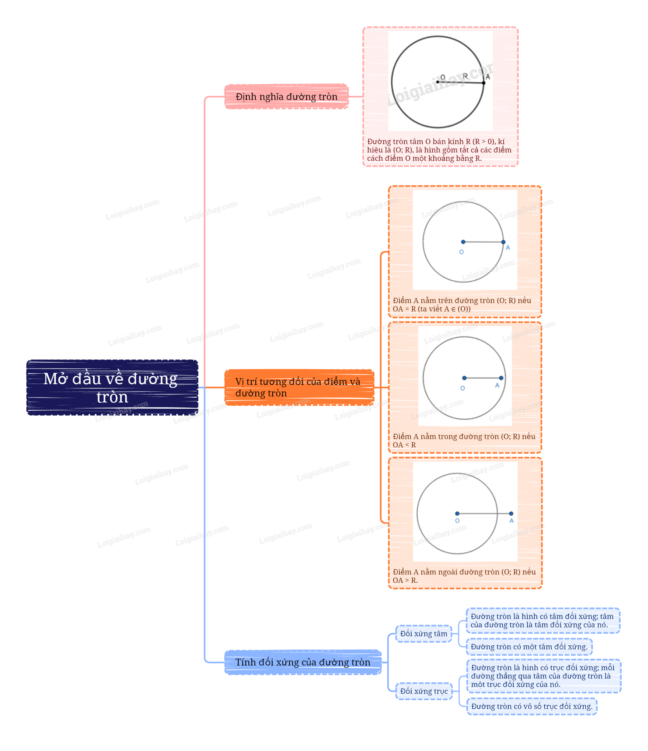 - Điểm A nằm trên đường tròn (O; R) nếu OA = R;