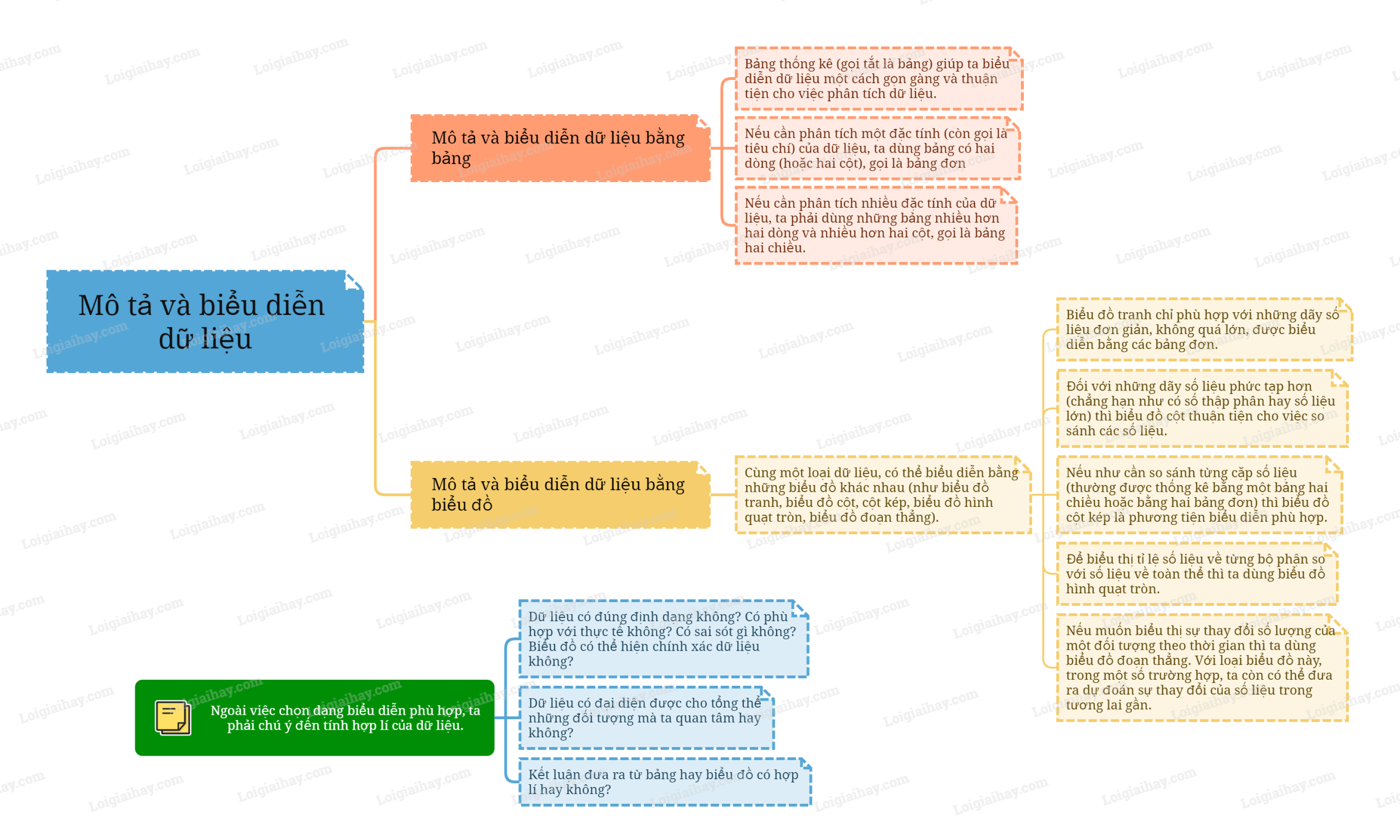 Cùng một loại dữ liệu, có thể biểu diễn bằng những biểu đồ khác nhau (như biểu đồ tranh, biểu đồ cột, cột kép, biểu đồ hình quạt tròn, biểu đồ đoạn thẳng).