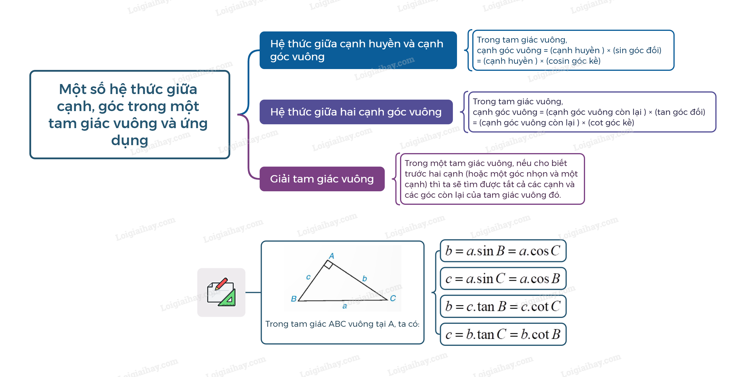 Trong tam giác vuông, mỗi cạnh góc vuông bằng cạnh góc vuông kia nhân với tang góc đối hoặc côtang góc kề. Cạnh góc vuông = (cạnh góc vuông còn lại ) × (tan góc đối) = (cạnh góc vuông còn lại ) × (cot góc kề) |