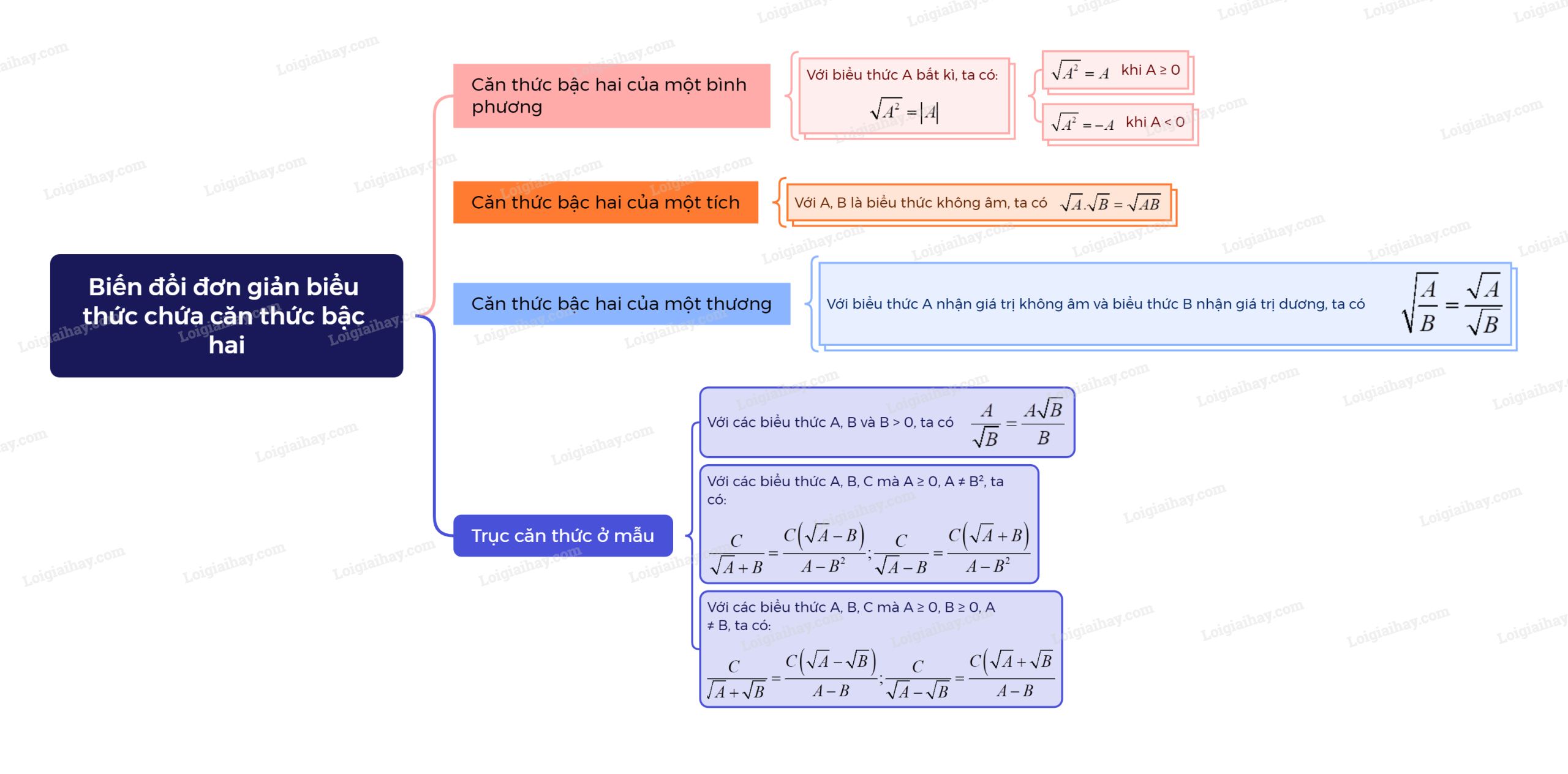 - Với các biểu thức A, B và B > 0, ta có \(\frac{A}{{\sqrt B }} = \frac{{A\sqrt B }}{B}\). - Với các biểu thức A, B, C mà \(B \ge 0,{A^2} \ne B\), ta có: \(\frac{C}{{A + \sqrt B }} = \frac{{C\left( {A - \sqrt B } \right)}}{{{A^2} - B}};\frac{C}{{A - \sqrt B }} = \frac{{C\left( {A + \sqrt B } \right)}}{{{A^2} - B}}\). (\(A - \sqrt B \) được gọi là biểu thức liên hợp của \(A + \sqrt B \) và ngược lại). - Với các biểu thức A, B, C mà \(A \ge 0,B \ge 0,A \ne B\), ta có: \(\frac{C}{{\sqrt A + \sqrt B }} = \frac{{C\left( {\sqrt A - \sqrt B } \right)}}{{A - B}};\frac{C}{{\sqrt A - \sqrt B }} = \frac{{C\left( {\sqrt A + \sqrt B } \right)}}{{A - B}}\). (\(\sqrt A - \sqrt B \) được gọi là biểu thức liên hợp của \(\sqrt A + \sqrt B \) và ngược lại). |
