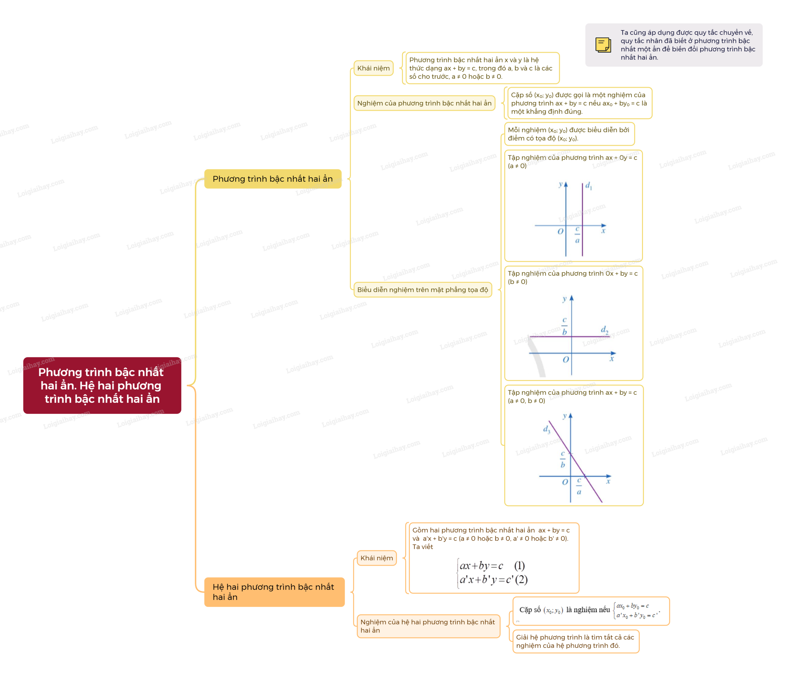- Mỗi nghiệm của phương trình \(ax + by = c\left( {a \ne 0,b \ne 0} \right)\) được biểu diễn bởi một điểm nằm trên đường thẳng \({d_3}:y = - \frac{a}{b}x + \frac{c}{b}\).
