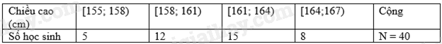 Ví dụ: Bảng tần số ghép nhóm cho mẫu số liệu chiều cao (đơn vị là cm) của học sinh lớp 9A với các nhóm [155; 158), [158; 161), [161; 164), [164;167):