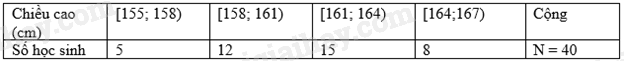 Tỉ số học sinh có chiều cao từ 150 cm đến dưới 158 cm là \(\frac{5}{{40}} = 12,5\% \);