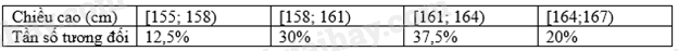 Bảng tần số tương đối ghép nhóm cho mẫu số này với các nhóm [155; 158), [158; 161), [161; 164), [164;167) là: