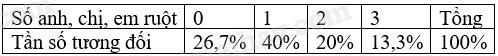 Số anh, chị, em ruột là \({x_1} = 0;{x_2} = 1;{x_3} = 2;{x_4} = 3\) tương ứng với \({m_1} = 8;{m_2} = 12;{m_3} = 6,{m_4} = 4\).