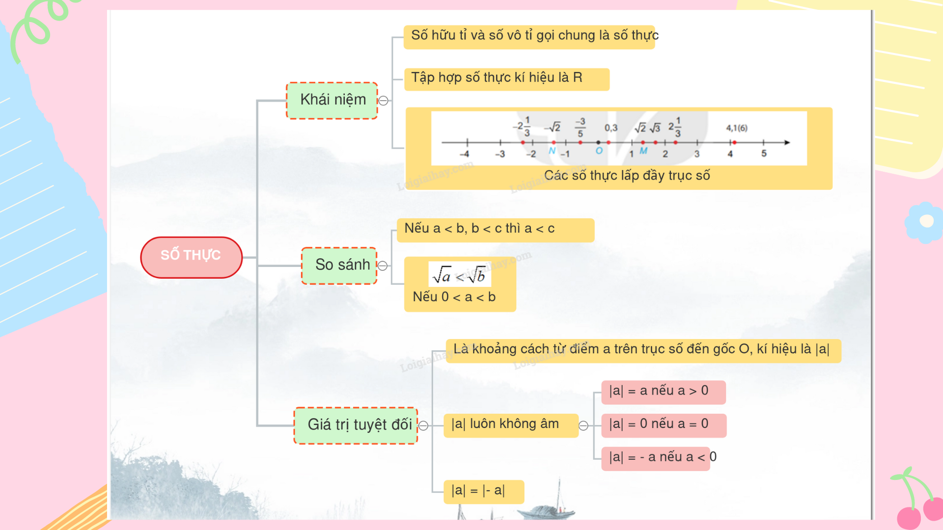 * Trục số thực được biểu diễn bởi 1 số điểm trên trục số. Ngược lại, mỗi điểm trên trục số đều biểu diễn một số thực.