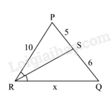 \(\begin{array}{l}\frac{{SQ}}{{SR}} = \frac{{RQ}}{{RP}}\\ \Leftrightarrow \frac{{10}}{5} = \frac{x}{6}\\ \Leftrightarrow 2 = \frac{x}{6}\\ \Leftrightarrow x = 12\end{array}\)