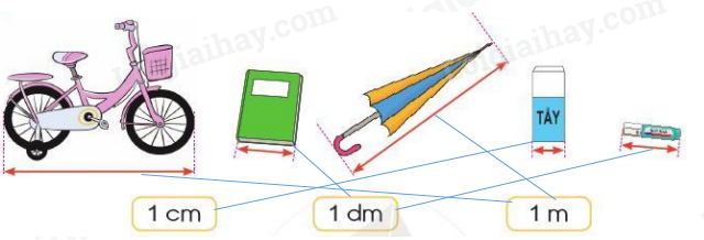 a) Quan sát hình vẽ để xác định các đồ vật có độ dài 1 cm, 1 dm, 1 m cho thích hợp.