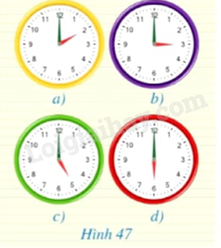 Trong Hình 47, coi mỗi khung đồng hồ là một đường tròn, kim giờ, kim phút là các tia. Số đo góc ở tâm trong mỗi hình 47a, 47b, 47c, 47d là bao nhiêu?