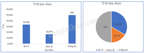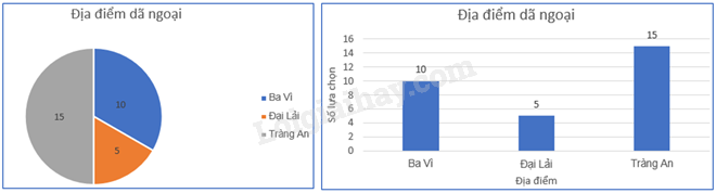 Hỏi ý kiến của các bạn trong lớp về địa điểm đi dã ngoại với ba lựa chọn: Tràng An, Ba Vì, Đại Lải thu được kết quả sau:
