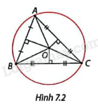 Vẽ tam giác ABC. Vẽ ba đường trung trực của tam giác ABC và xác định giao điểm O của chúng. Giải thích vì sao đường tròn tâm O bán kính OA đi qua cả ba đỉnh của (Delta )ABC. (Hình 7.2)