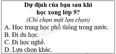 Bạn Minh muốn tìm hiểu về dự định của các bạn học sinh khối lớp 9 trong trường sau khi tốt nghiệp Trung học cơ sở. Em hãy giúp bạn Minh thực hiện khảo sát ý kiến của các bạn trong lớp mình theo mẫu phiếu bên