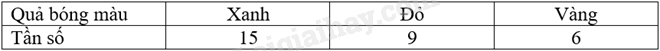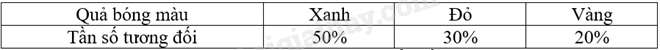 Có một túi kín đựng 10 quả bóng, mỗi quả bóng có một trong các màu xanh, đỏ hoặc vàng. Thực hiện 30 lần lấy bóng, mỗi lần lấy 1 quả, ghi lại màu quả bóng được lấy ra sau đó trả lại bóng vào túi và trộn đều.