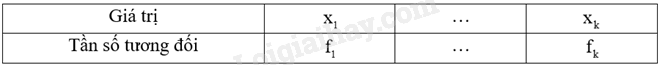Trong đó \(n = {m_1} + ... + {m_k}\) và \({f_1} = \frac{{{m_1}}}{n}.100\left( \% \right)\) là tần số tương đối của \({x_1}\), …, \({f_k} = \frac{{{m_k}}}{n}.100\left( \% \right)\) là tần số tương đối của \({x_k}\).