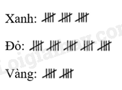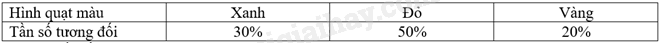 Quay 50 lần một tấm bìa hình tròn được chia thành ba hình quạt với các màu xanh, đỏ, vàng. Quan sát và ghi lại mũi tên chỉ vào hình quạt có màu nào khi tấm bìa dừng lại. Kết quả thu được như sau: