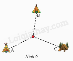 Có ba tổ dựng lều ở ba vị trí A, B, C như Hình 6. Ban tổ chức đặt ba thùng có dung tích bằng nhau tại một điểm tập kết chung. Mỗi tổ có sáu người, được phát một chiếc gàu giống nhau, các thành viên trong tổ chia thành từng cặp cõng nhau, múc nước từ tại của mình về đổ vào thùng tại điểm tập kết. Thùng của tổ nào đầy trước thì tổ đó chiến thắng. Để trò chơi công bằng, cần tìm điểm tập kết cách đều ba lều. Hãy xác định điểm đó.