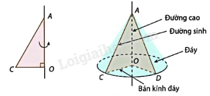 Dựa vào: Khi quay tam giác AOC vuông tại O một vòng quanh cạnh góc vuông OA cố định, ta được một hình nón. Khi đó: