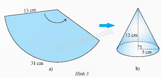 - Cắt tấm bìa hình quạt tròn có bán kính bằng độ dài đường sinh l = \(\sqrt {{5^2} + {{12}^2}} \) = 13 (cm), độ dài cung của hình quạt tròn bằng 10\(\pi \)cm \( \approx \) 31 cm (Hình 5a).
