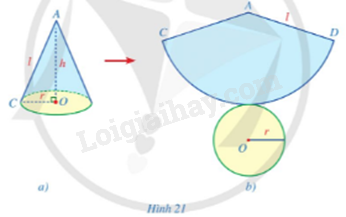 b) Từ hình nón đó, cắt rời đáy và cắt dọc theo đường sinh AC rồi trải phẳng ra, ta được hình khai triển mặt xung quanh của hình nón là một hình quạt tròn CAD tâm A với bán kính bằng độ dài đường sinh và độ dài cung CD bằng độ dài đường tròn đáy của hình nón (Hình 21b).