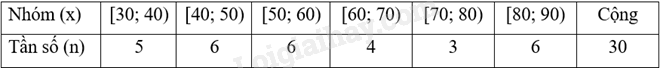 Lập bảng tần số ghép nhóm của mẫu số liệu đó sau khi được ghép nhóm theo sáu nhóm sau: [30; 40), [40; 50), [50; 60), [60; 70), [70; 80), [80; 90).