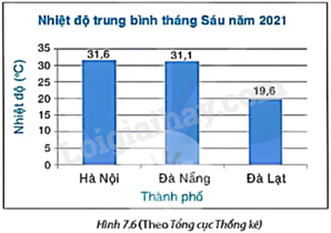 Biểu đồ cột sau biểu diễn nhiệt độ trung bình tháng Sáu tại ba thành phố của Việt Nam năm 2021.
