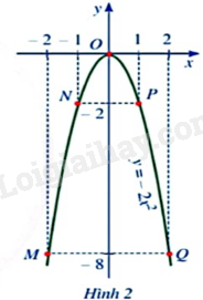 - Quan sát Hình 2, vẽ vẽ đường cong như ở Hình 2 đi qua 5 điểm M, N, O, P, Q. Đường cong đó được gọi là đường parabol và đường parabol đó là đồ thị của hàm số \(y = - 2{x^2}\).