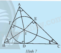 Gọi I là giao điểm ba đường phân giác của tam giác ABC. Vẽ ID, IE, IF lần lượt vuông góc với các cạnh BC, AC và AB (Hình 7).