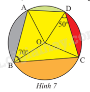Trong hình vẽ minh họa của học sinh có một tứ giác ABCD nội tiếp đường tròn tâm O (Hình 7). Cho biết \(\widehat {ABC}\) = 70o, \(\widehat {OCD}\) = 50o. Tìm góc \(\widehat {AOD}\).