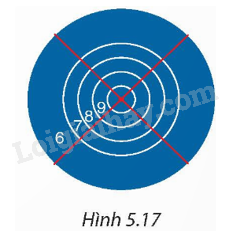 Một tấm bìa tạo bởi năm đường tròn đồng tâm lần lượt có bán kính là 5 cm, 10 cm, 15 cm, 20 cm và 30 cm (H.5.17). Giả thiết rằng người ném phi tiêu một cách ngẫu nhiên và luôn trúng bia. Tính xác suất ném trúng vòng 8 (hình vành khuyên nằm giữa đường tròn thứ hai và thứ ba), biết rằng xác xuất cần tìm bằng tỉ số giữa diện tích của hình vành khuyên tương ứng với diện tích của hình tròn lớn nhất.