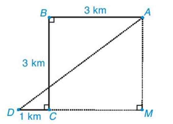 Để đón được một người khách, một xe taxi xuất phát từ vị trí điểm A, chạy dọc một con phố dài 3km đến điểm B thì rẽ vuông góc sang trái, chạy được 3km đến điểm C thì tài xế cho xe rẽ vuông góc sang phải, chạy 1km nữa thì gặp người khách tại điểm D (H.9.38). Hỏi lúc đầu, khoảng cách từ chỗ người lái xe đến người khác là bao nhiêu kilômét.