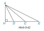 Cho hình 9.42, trong đó các đoạn thẳng AC, AD, AE đoạn nào có độ dài lớn nhất, đoạn nào có độ dài nhỏ nhất?