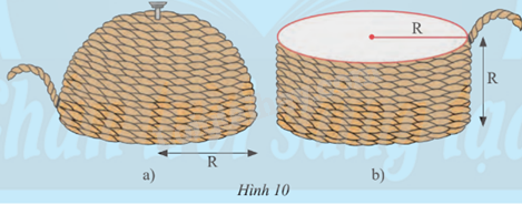 Nhà khoa học cổ đại Archimèdes đã khám phá ra cách tính diện tích của mặt cầu như sau: Lấy một nửa hình cầu bán kính R và một hình trụ có bán kính đáy R. Dùng sợi dây quấn quanh nửa mặt cầu như Hình 10a, rồi cùng đoạn dây đó người ta quấn quanh hình trụ như Hình 10b thì thấy chiều cao của phần hình trụ được quấn dây bằng bán kính R.