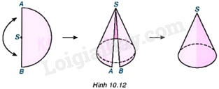 Cắt một nửa hình tròn bằng giấy cứng, đường kính \(AB = 20cm\)và tâm là S. Cuộn nửa hình tròn đó lại sao cho SA và SB sát vào nhau như Hình 10.12 (dùng băng keo dán), ta được một hình nón đỉnh S. Hãy cho biết độ dài đường sinh và chu vi đáy của hình nón đó.